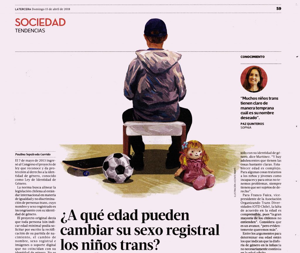El Director del Centro de Estudios en Psicología Clínica y Psicoterapia UDP, Dr. Claudio Martínez, opina sobre la edad adecuada para que niños trans cambien su sexo en el marco del Proyecto de Ley sobre de Identidad de Género. La Tercera, Tendencias, Domingo 15 de abril de 2018.